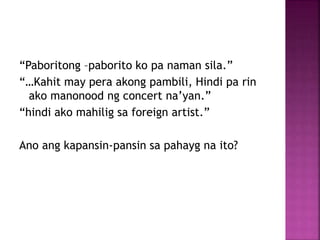 Wika na aPhatic bEmotive cExpressive 2Magbigay ng halimbawa ng pangungusap na nagpapakita ng gamit ng wika na phaticemotive at expressive Ebalwasyon. Isulat kung anong mga linya ng awit ang nagpapahayag ng opinyon. Nakatuon ito sa konteksto.